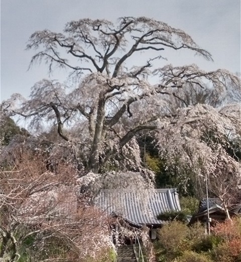 満開の紫金桜枝垂れ桜が三分咲き程度です。(令和5年3月23日)